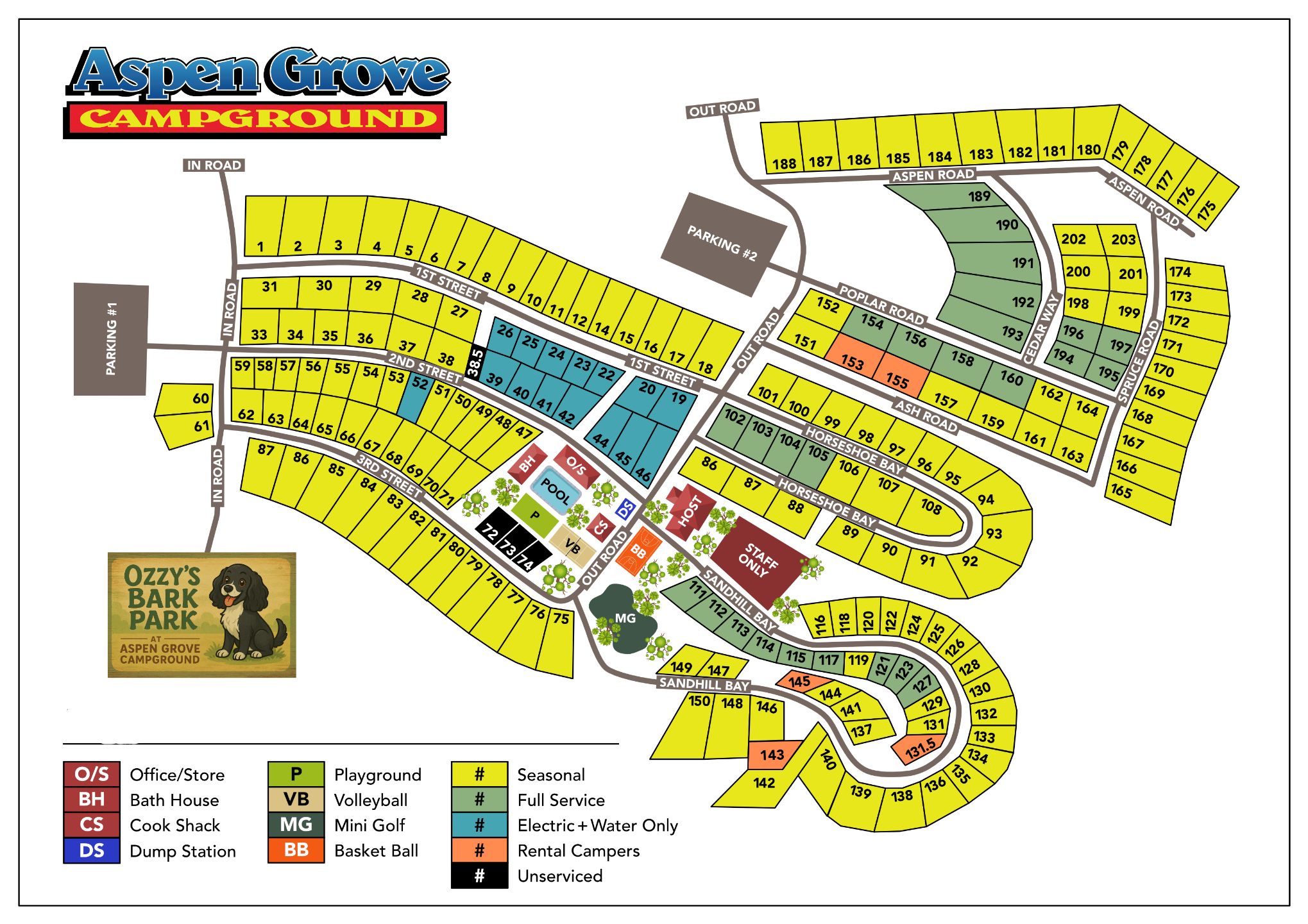 Looking for the perfect place to park your RV for summer? Aspen Grove offers seasonal, monthly, weekly, or nightly rates. We have 50 or 30 AMP full-service sites that are shady and private.